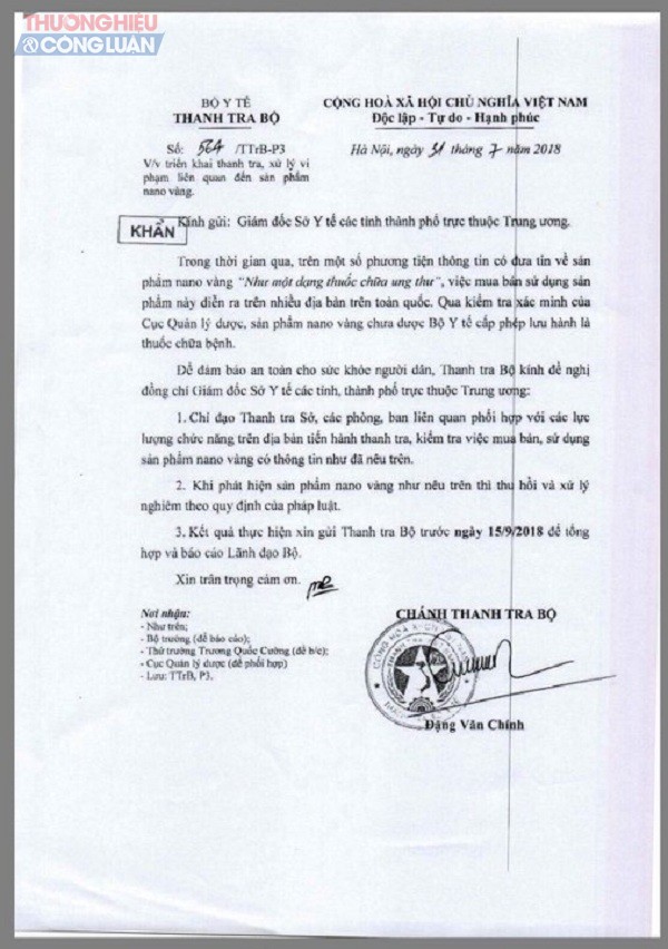 Trong công văn gửi các Sở Y tế, Thanh tra Bộ Y tế cho biết, trên một số phương tiện thông tin có đưa tin về sản phẩm nano vàng “Như một dạng thuốc chữa ung thư”, việc mua bán, sử dụng sản phẩm này diễn ra ở nhiều địa bàn trên toàn quốc. Qua kiểm tra xác minh của Cục Quản lý dược, sản phẩm nano vàng chưa được Bộ Y tế cấp phép lưu hành là thuốc chữa bệnh.