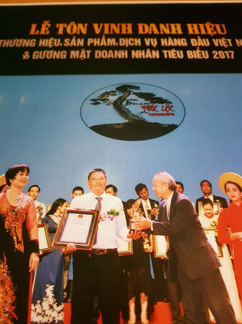 Nghệ nhân Nguyễn Phúc Lộc ( áo trắng ) trong lễ tôn vinh danh hiệu “ Thương hiệu, sản phẩm, dịch vụ hàng đầu Việt Nam và gương mặt doanh nhân tiêu biểu năm 2017”