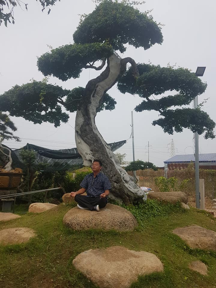 Chia sẻ với chúng tôi anh Phúc Lộc cho biết: “ Vườn cây cảnh bonsai của tôi có rất nhiều loại cây như: Sanh, Lũa, Dúi cổ thụ, Tùng, Phi lau,… Nhưng tôi lại đặc biệt yêu thích loại me keo. Cây Me Keo đại thụ tạo thế bonsai là một trong những loại cây khá là lạ với giới chơi cây kiểng. Nét đẹp của cây không chỉ dừng lại ở dáng và thế cây mà còn ở từng cái gai trên thân và lá. Đặc biệt nếu vào mùa me cây sẽ cho hoa thành từng chùm nhỏ, hoa của loại cây này có mùi thơm thoang thoảng và rất thu hút ong bướm. Cây me keo bonsai đại thụ khi có hoa và quả núc lỉu là một loại bonsai hiếm, rất hấp dẫn và bắt mắt người chơi.”