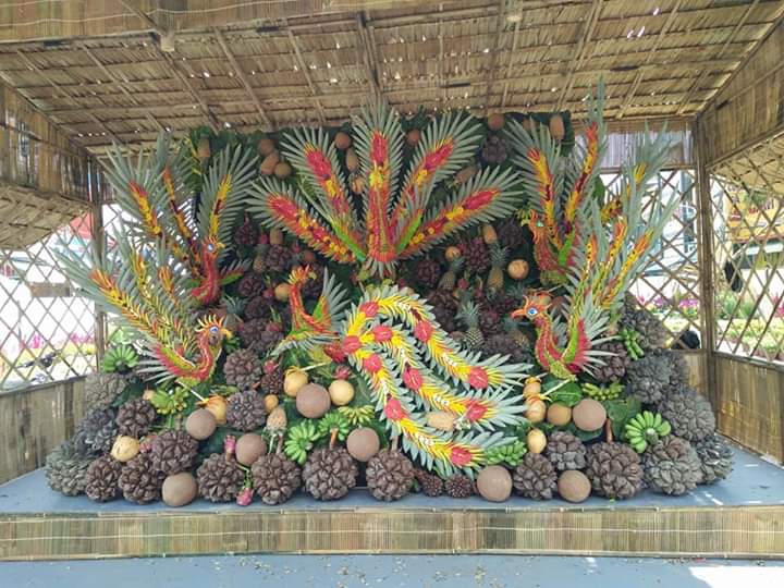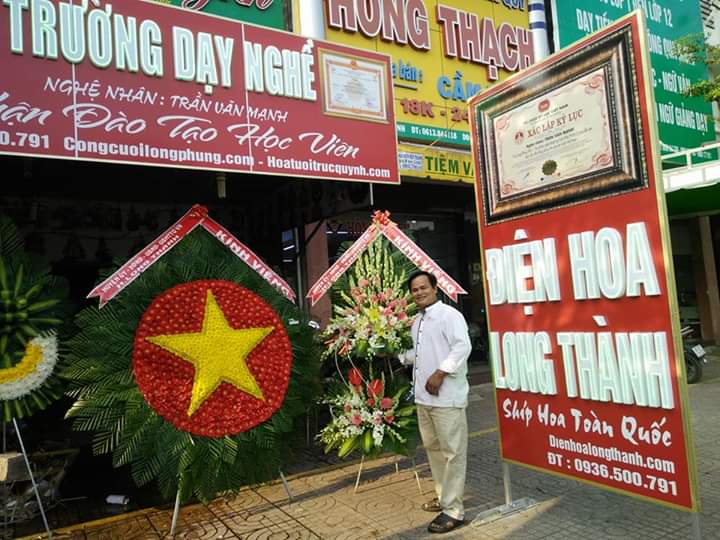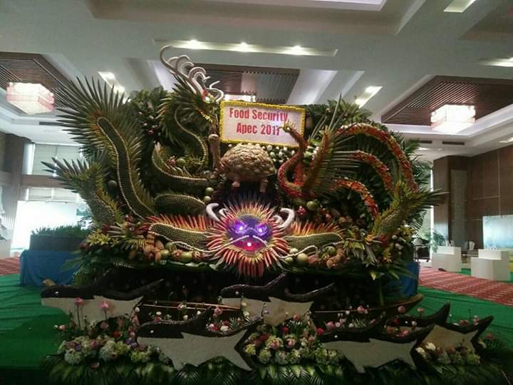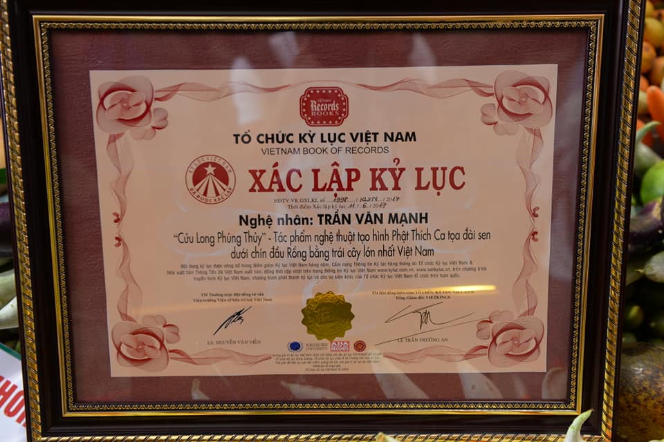 Đồng thời tác phẩm xác lập kỷ lục Việt Nam là “ tác phẩm tạo hình Phật Thích ca toạ đài sen dưới chín đầu Rồng bằng trái cây lớn nhất Việt Nam”