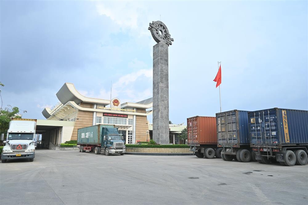 Phương tiện vận tải chờ thông quan ở cửa khẩu quốc tế Mộc Bài.