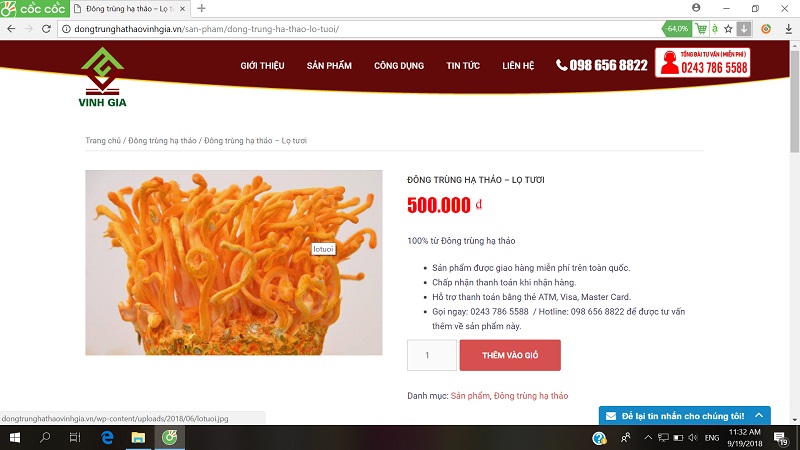 Đông trùng Hạ thảo dạng tươi quảng cáo trên website của Cty Vinh Gia