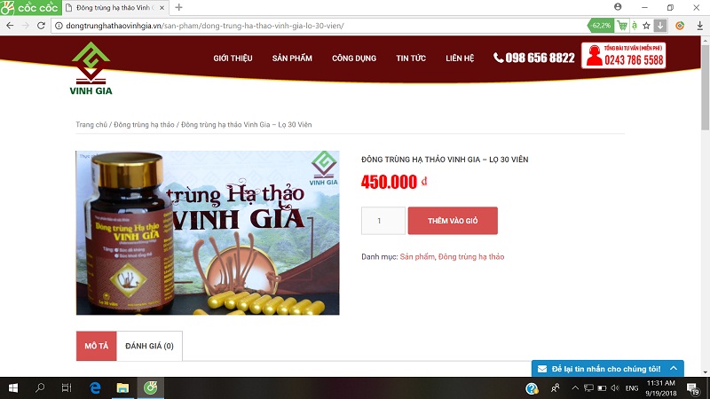 Đông trùng Hạ thảo Vinh Gia dạng viên loại 1 hộp 60 viên quảng cáo sai quy định đã bị tháo gỡ.