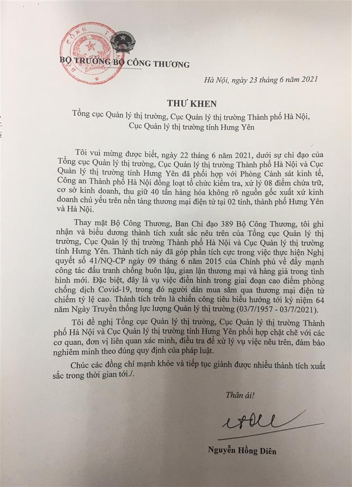 Thay mặt Bộ Công Thương, Ban Chỉ đạo 389 Bộ Công Thương, tôi ghi nhận và biểu dương thành tích xuất sắc nêu trên của Tổng cục Quản lý thị trường, Cục Quản lý thị trường Thành phố Hà Nội và Cục Quản lý thị trường tỉnh Hưng Yên. Thành tích này đã góp phần tích cực trong việc thực hiện Nghị quyết số 41/NQ-CP ngày 09 tháng 6 năm 2015 của Chính phủ về đẩy mạnh công tác đấu tranh chống buôn lậu, gian lận thương mại và hàng giả trong tình hình mới. Đặc biệt, đây là vụ việc điển hình trong giai đoạn cao điểm phòng chống dịch Covid-19, trong đó người dân mua sắm qua thương mại điện tử chiếm tỷ lệ cao. Thành tích trên là chiến công tiêu biểu hướng tới kỷ niệm 64 năm Ngày Truyền thống lực lượng Quản lý thị trường (03/7/1957-03/7/2021).