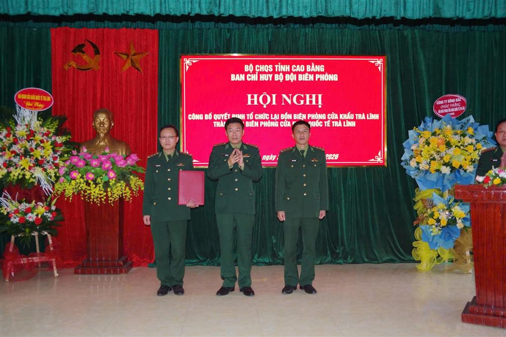 Tại hội nghị, đại diện Ban Chỉ huy Bộ đội Biên phòng tỉnh Cao Bằng đã công bố Quyết định số 6582/QĐ-BQP ngày 22/12/2025 của Bộ trưởng Bộ Quốc phòng về việc tổ chức lại Đồn Biên phòng cửa khẩu Trà Lĩnh; Quyết định số 3283/QĐ-TM ngày 23/12/2025 của Tổng Tham mưu trưởng Quân đội nhân dân Việt Nam ban hành biểu tổ chức, biên chế Đồn Biên phòng cửa khẩu quốc tế Trà Lĩnh thuộc Ban Chỉ huy Bộ đội Biên phòng tỉnh Cao Bằng. Đồng thời, công bố các quyết định đổi tên tổ chức đảng, tổ chức quần chúng của đơn vị theo quy định.