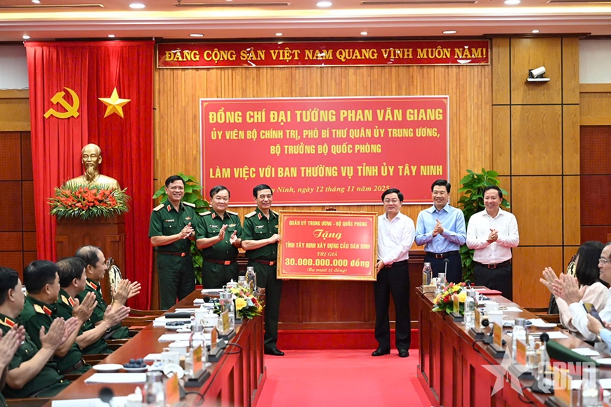 Nhân dịp này, thay mặt Quân ủy Trung ương và Bộ Quốc phòng, Đại tướng Phan Văn Giang đã trao tặng tỉnh Tây Ninh công trình dân sinh trị giá 30 tỷ đồng nhằm góp phần cải thiện hạ tầng vùng khó khăn, nâng cao đời sống người dân khu vực biên giới.