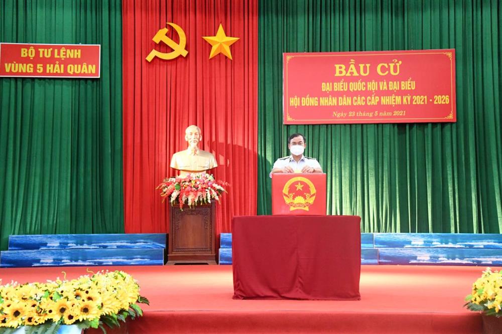 Thượng tá Hoàng Quốc Hoàn, Chủ nhiệm Chính trị Vùng 5 Hải quân cho biết: “Công tác sẵn sàng chiến đấu bảo vệ bầu cử là nhiệm vụ chính trị quan trọng. Chính vì vậy, các ca, kíp, hệ thống trực các cấp trong toàn Vùng được duy trì đồng bộ 24/24. Đối với lực lượng này, chúng tôi đã chỉ đạo các đơn vị điều động người luân phiên thay nhau canh trực để đi bỏ phiếu, bảo đảm 100% cán bộ, chiến sĩ đều được thực hiện quyền công dân của mình trong ngày hội lớn của đất nước”.