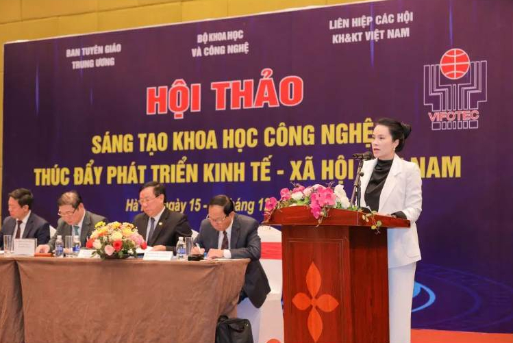 Bà Nguyễn Hồng Hạnh - Tổng Giám đốc Tập đoàn GFS, Phó Viện trưởng Viện Công nghệ GFS trình bày bài tham luận tại Hội Thảo