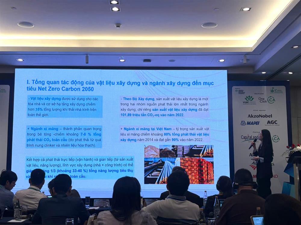 Bà Nguyễn Thị Thùy Linh, nghiên cứu viên của Trung tâm Thiết bị, Môi trường và An toàn lao động - Viện Vật liệu Xây dựng chia sẻ tại sự kiện, ngành xây dựng hiện chiếm tỷ trọng lớn trong phát thải khí nhà kính, do đó việc phát triển các cơ chế minh bạch hóa thông tin môi trường thông qua phân tích vòng đời (LCA) và tuyên bố sản phẩm môi trường (EPD) đang trở thành xu hướng tất yếu để đảm bảo tính bền vững và cạnh tranh cho doanh nghiệp. Việt Nam đang thể hiện rõ cam kết phát triển bền vững ngành vật liệu xây dựng thông qua việc xây dựng và hoàn thiện khung pháp lý, chính sách và công cụ quản lý môi trườngtrong ngành vật liệu xây dựng. Các định hướng chiến lượcquốc gia như Chiến lược tăng trưởng xanh, cam kết đạt phát thải ròng bằng “0” vào năm 2050, thúc đẩy sản xuất xanh và áp dụng công cụ LCA, EPD.