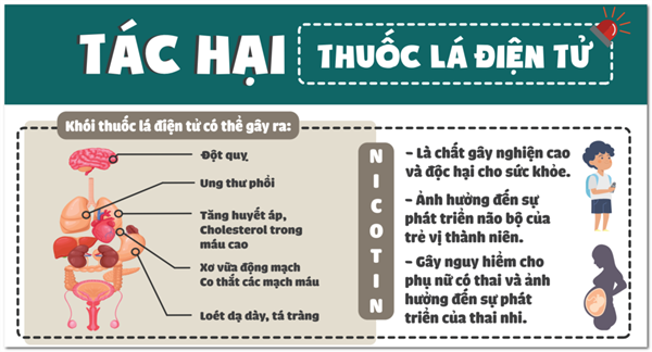Theo Tổ chức Y tế Thế giới (WHO), sử dụng thuốc lá điện tử và thuốc lá nung nóng đều có hại cho sức khỏe của cả người hút và người xung quanh tương tự như thuốc lá thông thường. Các sản phẩm thuốc lá mới có chứa nicotine là chất gây nghiện cao, độc hại, gây bệnh tim mạch, hô hấp, tiêu hóa và ung thư.