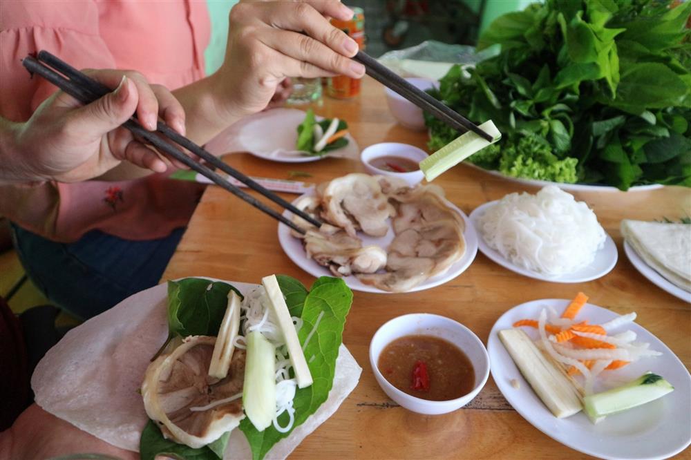 Cuốn thịt luộc với bánh tráng phơi sương – rau rừng