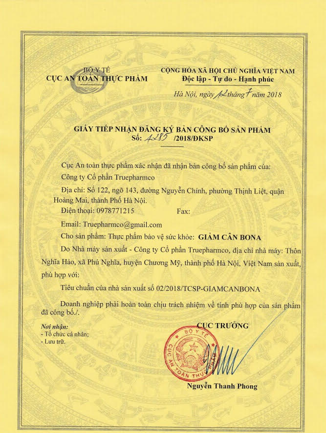 Viên giảm cân Bona được sản xuất bởi công ty dược phẩm Truepharmco - Nghĩa Hào- Phú Nghĩa - Chương Mỹ- Hà Nội.