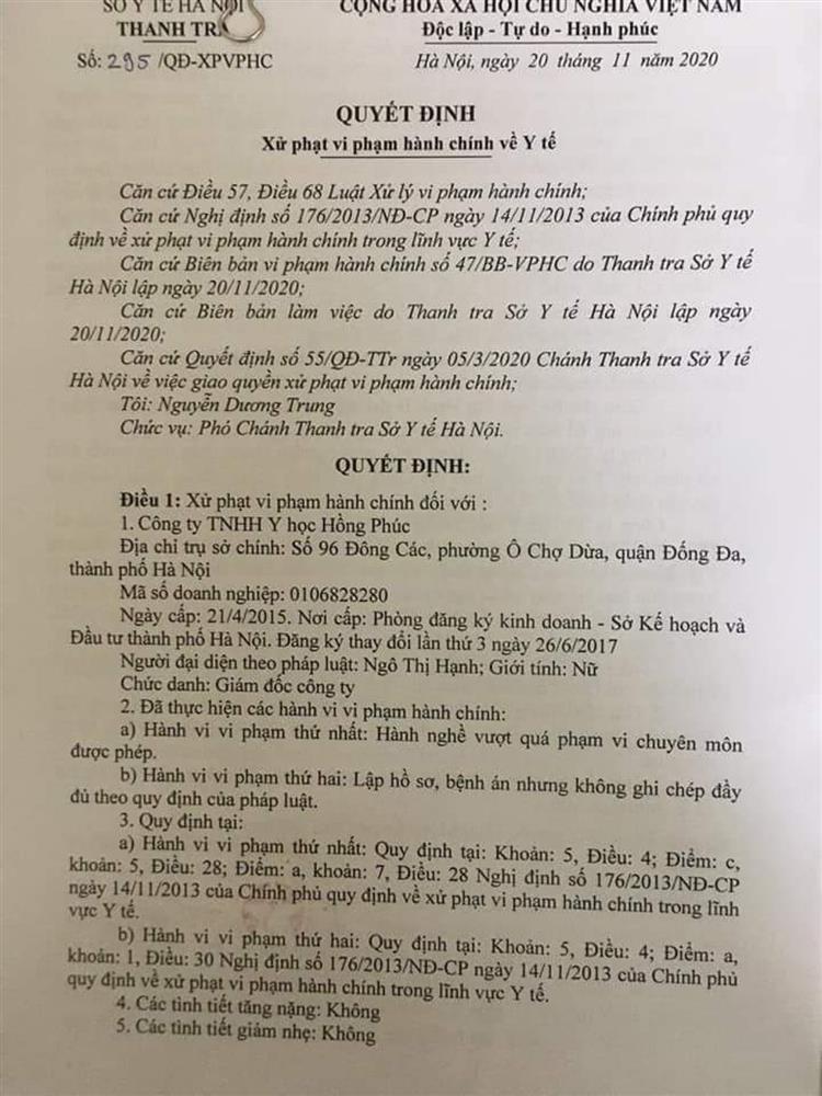 Được biết, Công ty TNHH Y tế Hồng Phúc có địa chỉ tại số 96 Đông Các, phường Ô Chợ Dừa, quận Đống Đa, Hà Nội do bà Ngô Thị Hạnh giữ chức vụ giám đốc. Trong quá trình làm việc, bà Nguyễn Thị Hưng- nhân viên khám bệnh của công ty TNHH Y tế Hồng Phúc đã có hành vi vi phạm hành nghề vượt quá phạm vi chuyên môn được phép, thuộc Khoản 5, Điều 4; Điểm c, khoản: 5, Điều: a, khoản: 7, Điều: 28 Nghị định số 176/2013/NĐ-CP. Ngoài ra, còn có hành vi lập hồ sơ, bệnh án nhưng không ghi chép đầy đủ theo đúng quy định của pháp luật, quy định tại Khoản 5, Điều 4, Điểm a, khoản 1, Điều: 30 Nghị định số 176/2013/NĐ-CP.