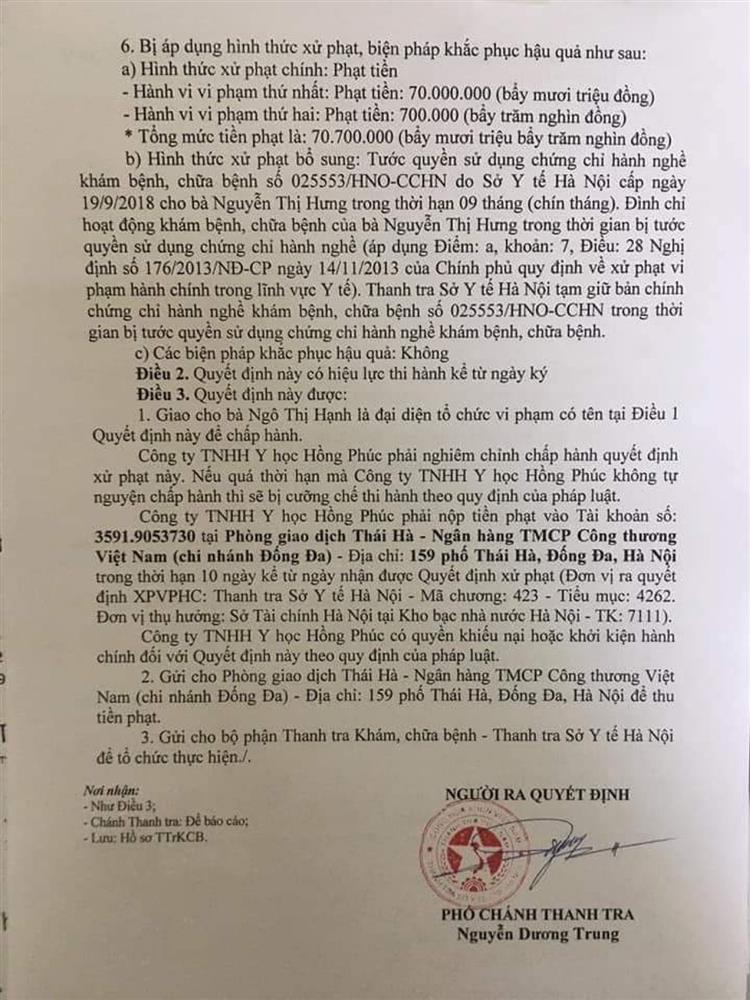 Đồng thời xử phạt hành chính với người đại diện theo pháp luật Công ty TNHH Y tế Hồng Đức bà Nguyễn Thị Hạnh, tổng số tiền là 70.700.000 (bảy mươi triệu bảy trăm nghìn đồng). Quyết định được giao cho bà Ngô Thị Hạnh là đại diện theo pháp luật của Công ty TNHH Y tế Hồng Phúc chấp hành.