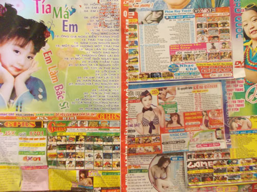 Không chỉ có sách báo, các khách hàng nhỏ tuổi ngày nay còn dễ dàng tiếp cận với các loại băng đĩa được sao lậu, bày bán tràn lan từ người bán dạo cho tới các cửa hàng sách báo, băng đĩa. Sẽ không có gì đáng nói, nếu như trên bìa đĩa không chi chít những hình ảnh quảng cáo 18+, bất chấp nội dung đĩa là dành cho trẻ em lứa tuổi nào.