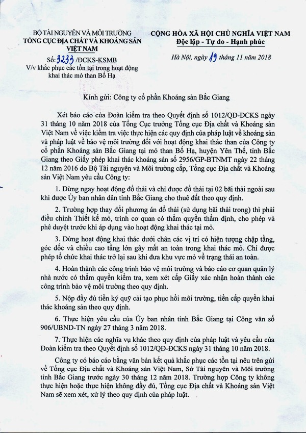 Công ty có báo cáo bằng văn bản kết quả khắc phục các tồn tại nêu trên gửi về Tổng cục Địa chất và Khoáng sản Việt Nam, Sở Tài nguyên và Môi trường tỉnh Bắc Giang trước ngày 30/12/2018.