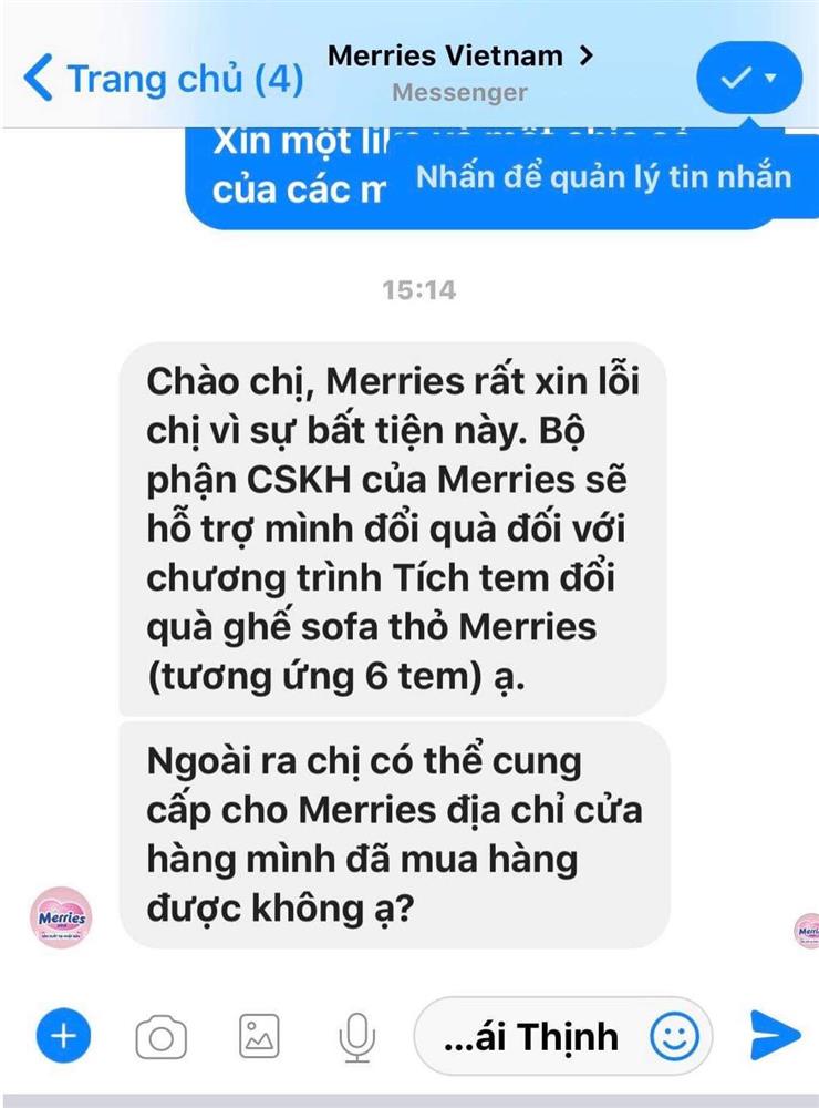 Chị Hoàng Lâm cho biết, sau vụ việc, chị có liên hệ trực tiếp với đại diện của hãng bỉm Merries tại Việt Nam thì nhận được câu trả lời: “Chào chị, Merries rất xin lỗi chị vì sự bất tiện này. Bộ phận CSKH của Merries sẽ hỗ trợ mình đổi quà đối với chương trình tích tem đổi quà ghế sofa thỏ Merries (tương ứng 6 tem) ạ”.