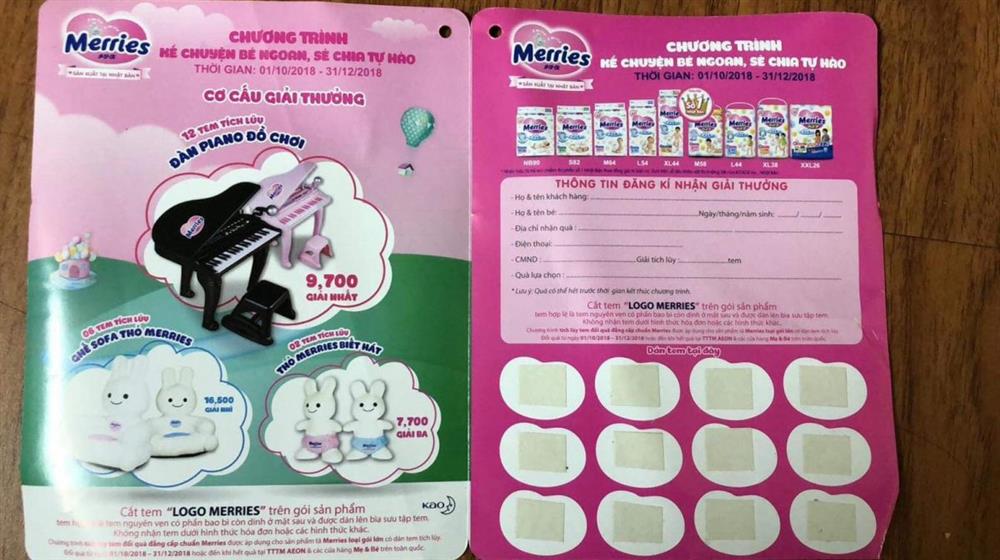 Theo tìm hiểu của PV, hãng bỉm Merries đã tổ chức chương trình “Kể chuyện bé ngoan, chia sẻ tự hào” trong thời gian từ 1/10/2018 – 31/12/2018. Cơ cấu giải thưởng bao gồm: 12 tem tích lũy thì được đàn piano đồ chơi với 9.700 giải nhất; 6 tem tích lũy thì được ghế sofa thỏ Merries với 16.500 giải nhì; 2 tem tích lũy được thỏ Merries biết hát với 7.700 giải ba.