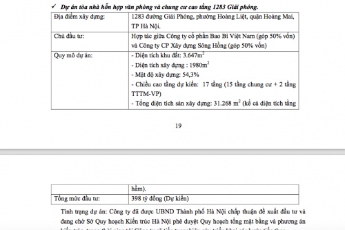 Ngoài ra, trong quá trình PV tìm hiểu thông tin, được biết cách đây nhiều năm tại địa chỉ số 1283 đường Giải Phóng có một dự án mang tên “Tổ hợp Thương mại, căn hộ chung cư 1283 Giải Phóng – Hà Nội” với tổng mức đầu tư 479 tỷ đồng, có chủ đầu tư là Công ty Cổ phần Bao bì Việt Nam, Công ty Cổ phần xây dựng Sông Hồng và Công ty Cổ phần Kinh doanh Dịch vụ cao cấp Dầu khí Việt Nam (PVR). Dự án đã được UBND Thành phố Hà Nội chấp thuận đề xuất đầu tư và đang chờ Sở quy hoạch Kiến trúc Hà Nội phê duyệt Quy hoạch tổng mặt bằng và phương án kiến trúc.