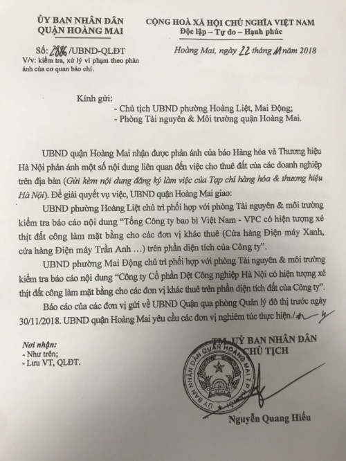 Mặc dù, trong văn bản có yêu cầu rõ UBND quận Hoàng Mai yêu cầu các đơn vị nghiêm túc thực hiện, nhưng cho đến ngày 3/12/2018, khi PV liên hệ lại, đồng chí Diêm – cán bộ phòng Quản lý đô thị UBND quận Hoàng Mai vẫn nói rằng chưa có câu trả lời do các phường vẫn chưa báo cáo lại quận và đề nghị PV trực tiếp xuống liên hệ làm việc với phường.