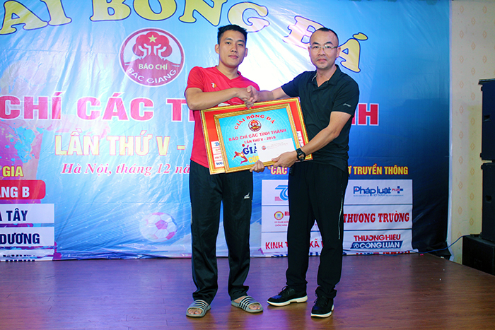 Nhà báo Đình Dũng - Tổng thư ký Tạp chí Hàng hoá & Thương hiệu HN, Chủ tịch FC báo chí Thanh Hoá trao giải cho CLB FC Báo chí Nghệ Tĩnh.