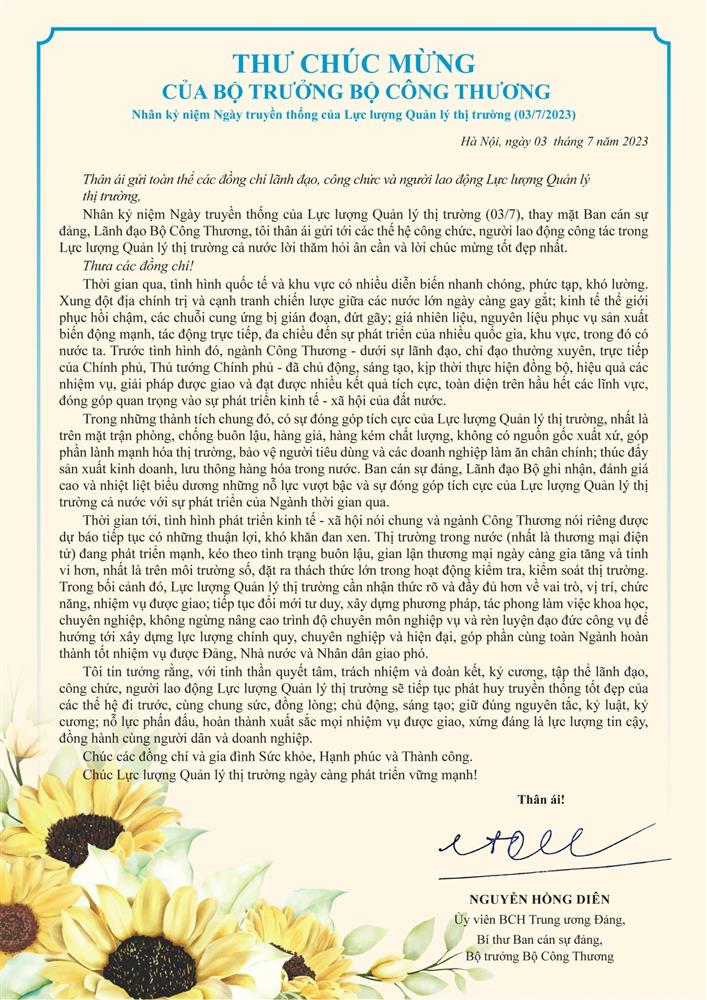 Nhân kỷ niệm Ngày truyền thống của Lực lượng Quản lý thị trường (03/7), thay mặt Ban cán sự đảng, Lãnh đạo Bộ Công Thương, Bộ trưởng Bộ Công Thương Nguyễn Hồng Diên gửi tới các thế hệ công chức, người lao động công tác trong lực lượng Quản lý thị trường cả nước lời thăm hỏi thân thiết và lời chúc mừng nồng nhiệt nhất. Tạp chí Kinh doanh và Biên mậu Việt Nam xin giới thiệu toàn văn Thư chúc mừng của Bộ trưởng Bộ Công Thương Nguyễn Hồng Diên