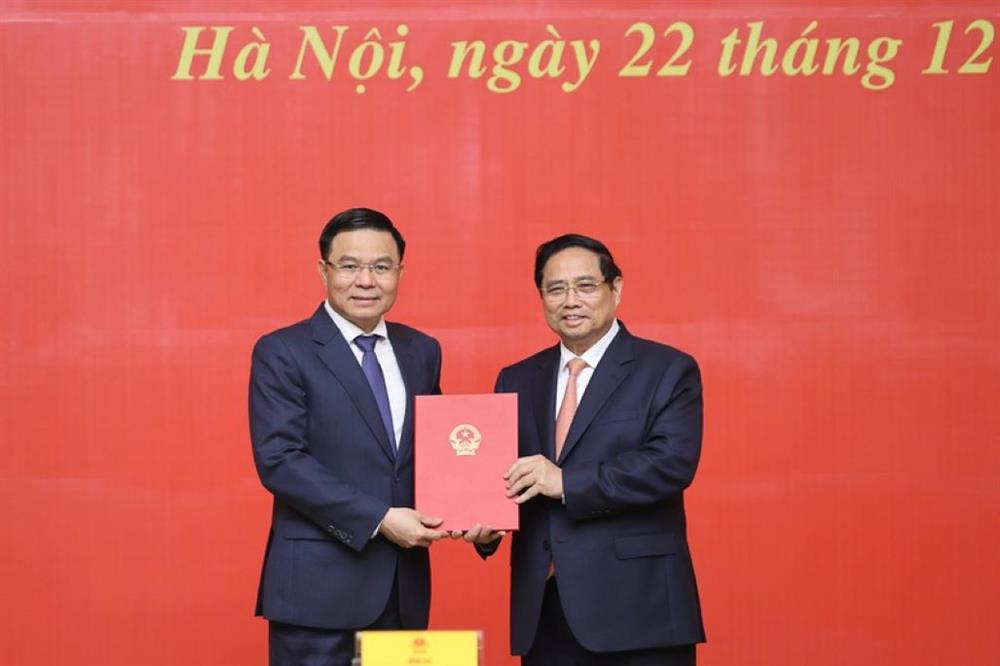 Thủ tướng Chính phủ Phạm Minh Chính trao quyết định Quyền Bộ trưởng Bộ Công Thương cho ông Lê Mạnh Hùng. Ảnh VGP.