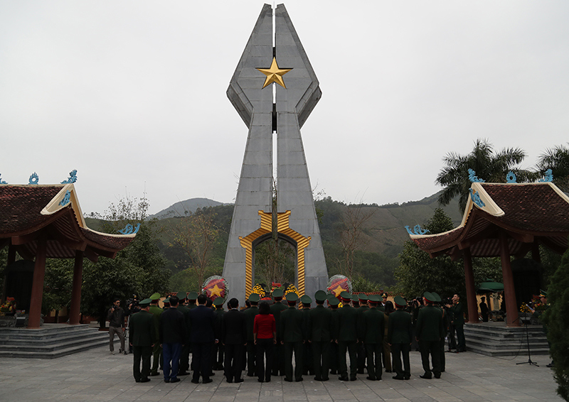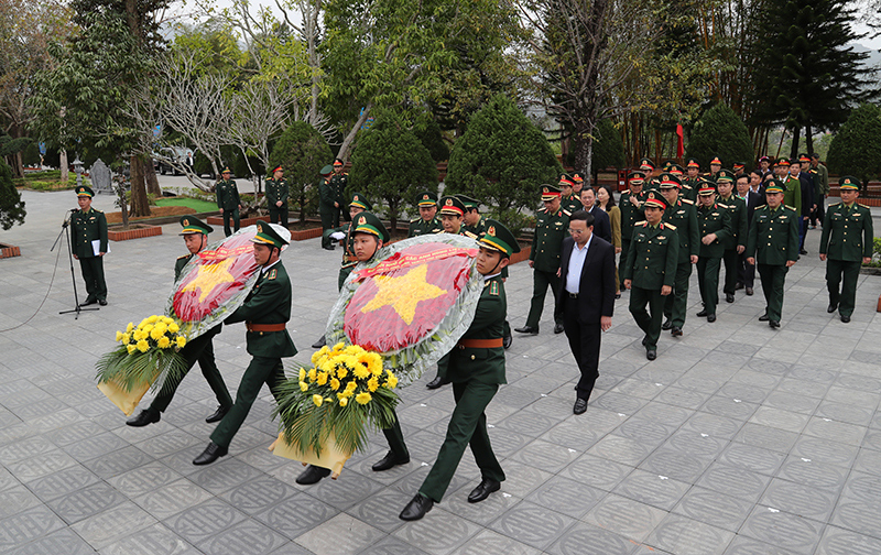 Đại tướng Phan Văn Giang và các đại biểu dâng hoa, dâng hương tưởng niệm cán bộ, chiến sĩ Đồn Biên phòng Pò Hèn và cán bộ Lâm trường Hải Sơn, nhân viên thương nghiệp Móng Cái.
