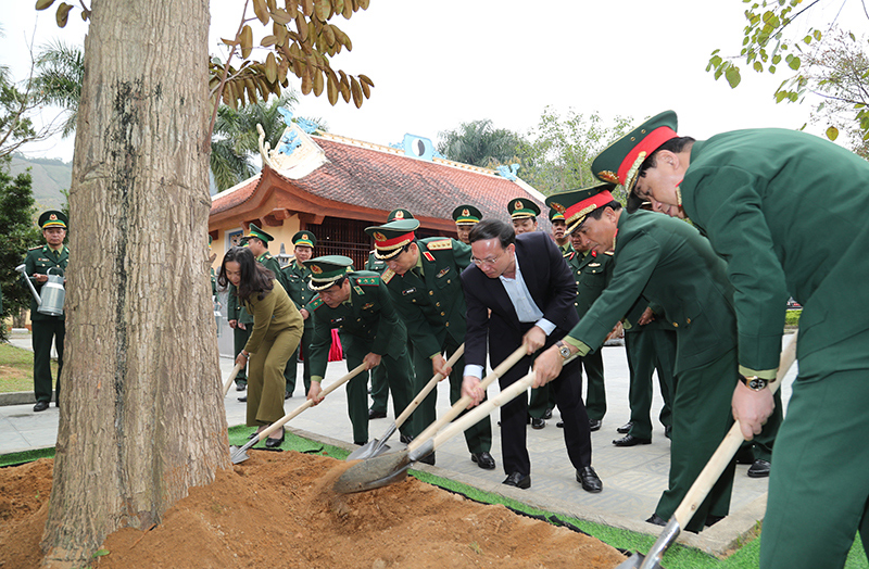 Đại tướng Phan Văn Giang và các đại biểu trồng cây lưu niệm trong khuôn viên Khu tưởng niệm các anh hùng liệt sĩ Pò Hèn.