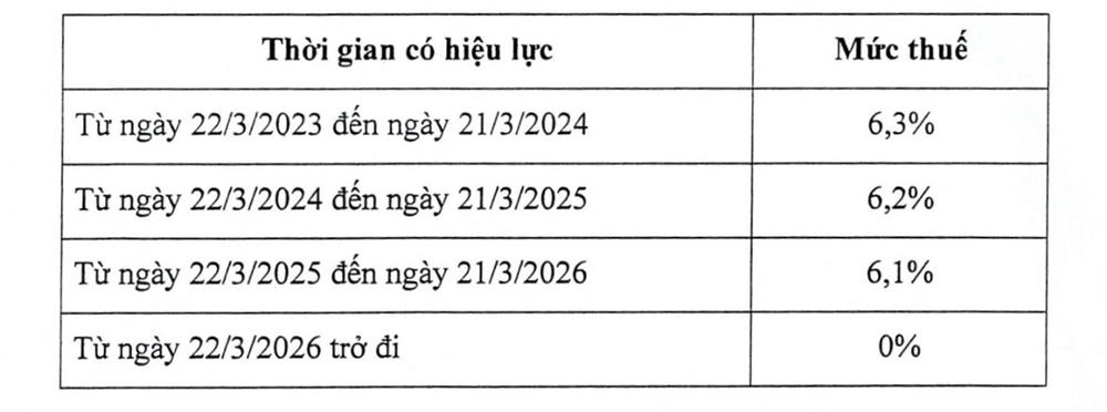 Theo đó, từ 22/3/2023 đến 21/3/2024, mức thuế áp dụng là 6,3%; từ 22/3/2024 đến 21/3/2025 mức thuế áp dụng là 6,2%; từ 22/3/2025 đến 21/3/2026 mức thuế áp dụng là 6,1% và sẽ về 0% từ 22/3/2026.