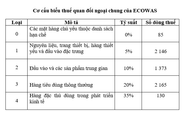 1/ Cấu trúc biểu thuế quan đối ngoại chung (TEC) được xây dựng dựa trên Hệ thống hài hòa được các nước thành viên thông qua, gồm 5.899 dòng thuế, chia thành 5 loại thuế như sau: Loại thứ nhất gồm 85 dòng thuế có mức thuế là 0% xếp vào vào nhóm 0; loại thứ 2 gồm 2.146 dòng thuế có mức thuế là 5%, xếp vào nhóm 1; loại thứ 3 gồm 1.373 dòng thuế có mức thuế là 10%, xếp vào nhóm 2; loại thứ 4 gồm 2.165 dòng thuế có mức thuế là 20%, xếp vào nhóm 3; và loại thứ 5 gồm 130 dòng thuế có mức thuế là 35%, xếp vào nhóm 4.