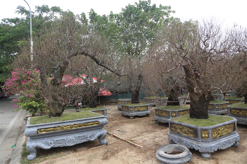Các gốc đào cổ thụ được đặt trong các chậu cây mang họa tiết cầu kỳ, mạ vàng, có họa tiết con trâu đặc trưng của năm Tân Sửu.