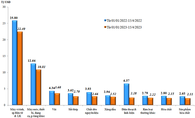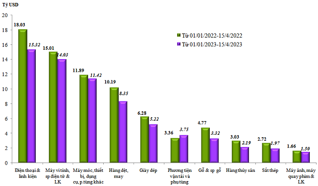 Một số nhóm hàng có trị giá xuất khẩu kỳ 1 tháng 4/2023 giảm so với kỳ 2 tháng 3/2023, gồm: máy vi tính, sản phẩm điện tử và linh kiện giảm 672 triệu USD (tương ứng giảm 25,2%); điện thoại các loại và linh kiện giảm 565 triệu USD (tương ứng giảm 22,9%); máy móc, thiết bị, dụng cụ và phụ tùng khác giảm 434 triệu USD (tương ứng giảm 21,7%); sắt thép các loại giảm 230 triệu USD (tương ứng giảm 47,7%); hàng dệt may giảm 211 triệu USD (tương ứng giảm 15,2%)...
