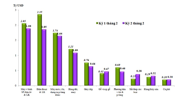 Trị giá xuất khẩu kỳ 2 tháng 02/2023 biến động giảm so với kỳ 1 tháng 02/2023 ở một số nhóm hàng sau: điện thoại các loại & linh kiện giảm 492 triệu USD, tương ứng giảm 21%; máy vi tính, sản phẩm điện tử & linh kiện giảm 166 triệu USD, tương ứng giảm 8,1%; phương tiện vận tải & phụ tùng giảm 139 triệu USD, tương ứng giảm 23%...