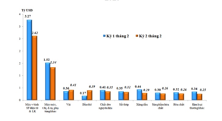 Trị giá nhập khẩu hàng hóa trong kỳ 2 tháng 02/2023 giảm so với kỳ 1 trước đó chủ yếu ở một số nhóm hàng sau: máy vi tính, sản phẩm điện tử & linh kiện giảm 651 triệu USD, tương ứng giảm 19,9%; máy móc, thiết bị, dụng cụ & phụ tùng khác giảm 188 triệu USD, tương ứng giảm 12,3%; xăng dầu các loại giảm 143 triệu USD, tương ứng giảm 32,8%...