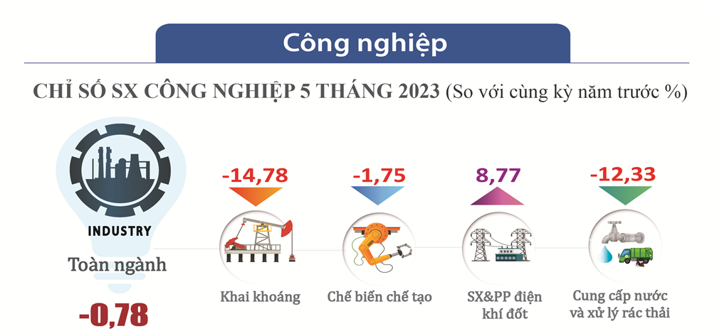 Chỉ số sản xuất toàn ngành công nghiệp của Hà Tĩnh 5 tháng đầu năm giảm 0,78% so cùng kỳ năm 2022. Cụ thể: Ngành công nghiệp khai khoáng giảm 14,78%, làm giảm 0,14 điểm phần trăm; ngành công nghiệp chế biến, chế tạo giảm 1,75% làm giảm 1,49 điểm phần trăm (là ngành đóng góp chủ yếu vào mức tăng chung toàn ngành công nghiệp); ngành sản xuất và phân phối điện tăng 8,77%, làm tăng 1,1 điểm phần trăm; ngành cung cấp nước và xử lý rác thải, nước thải giảm 12,33%, làm giảm 0,25 điểm phần trăm vào mức tăng chung toàn ngành.