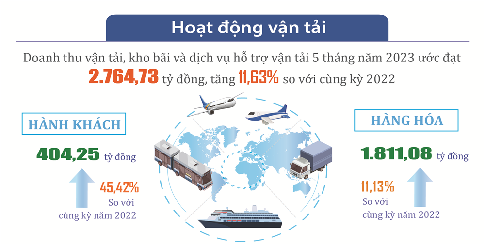 Tính chung 5 tháng đầu năm, doanh thu vận tải của Hà Tĩnh dự tính đạt hơn 2.764 tỷ đồng, tăng 11,63% so với cùng kỳ năm trước. Trong đó, vận tải hành khách ước đạt 404,25 tỷ đồng, tăng 45,42%; hàng hoá ước đạt 1.811,08 tỷ đồng, tăng 11,13%; kho bãi, dịch vụ hỗ trợ vận tải ước đạt 472,99 tỷ đồng, giảm 16,25% so với cùng kỳ năm trước.