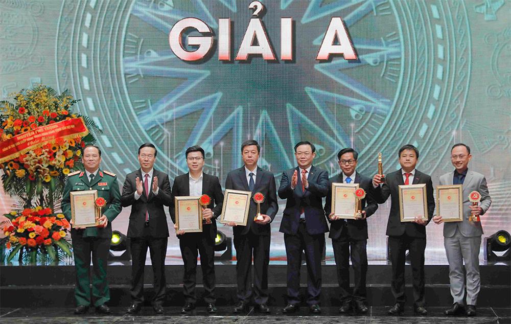 Chủ tịch Quốc hội Vương Đình Huệ và Thường trực Ban Bí thư Võ Văn Thưởng trao Giải A cho tác giả và nhóm tác giả.