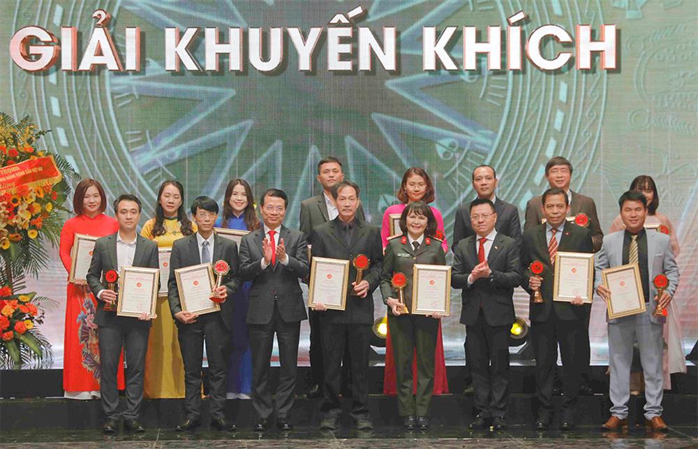 Bộ trưởng Bộ Thông tin và Truyền thông Nguyễn Mạnh Hùng và Tổng Biên tập Báo Nhân dân Lê Quốc Minh trao giải Khuyến khích cho các tác giả, nhóm tác giả.