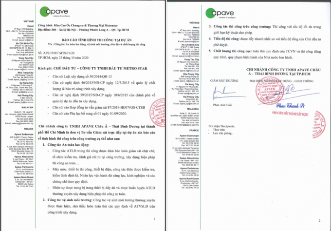 Xác nhận của Apave (Công ty Giám sát nổi tiếng của Cộng hòa Pháp thành lập từ năm 1867) về tiến độ thi công của dự án Metro Star.