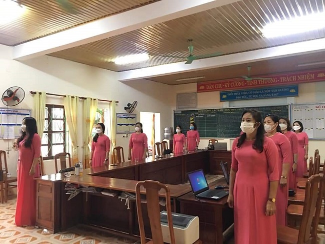 Tập thể Giáo viên trường Tiểu học Quang Phong, Tx Thái Hòa làm lễ khai giảng trực tuyến năm học 2021 - 2022