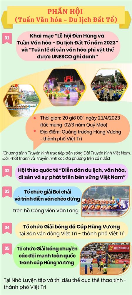 Nổi bật là chương trình Khai mạc "Lễ hội Đền Hùng và Tuần Văn hóa - Du lịch Đất Tổ năm 2023" và "Tuần lễ di sản văn hóa phi vật thể được UNESCO ghi danh" vào 20h ngày 21/4 tại Quảng trường Hùng Vương; Hội thảo quốc tế "Diễn đàn du lịch, văn hóa, di sản và sự phát triển bền vững Việt Nam"; Giải Bơi chải và trình diễn ván chèo đứng trên hồ Công viên Văn Lang; Giải bóng đá Cúp Hùng Vương; giải bóng chuyền các đội mạnh toàn quốc tranh cúp Hùng Vương; hội chợ Du lịch Tây Bắc năm 2023…