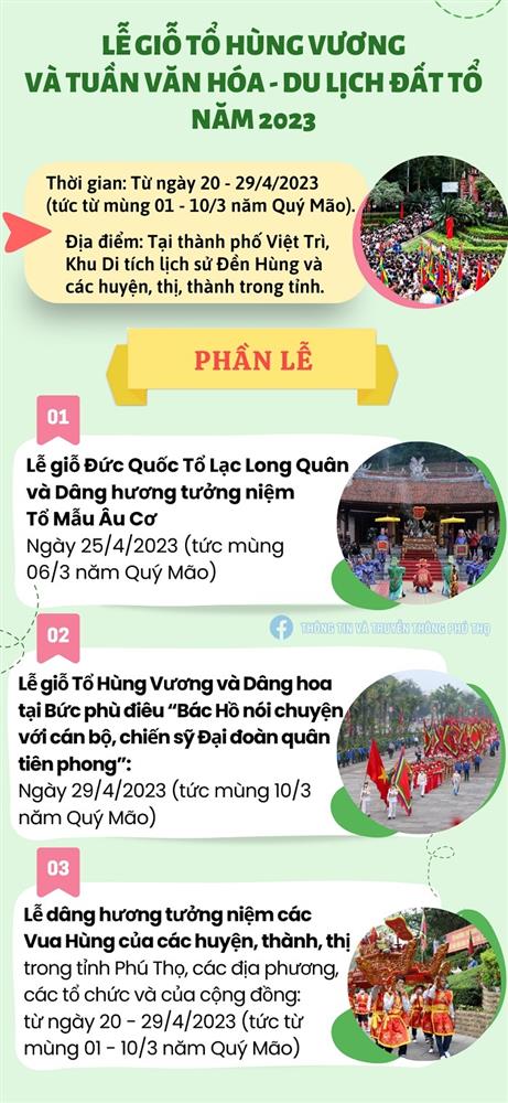 Theo thông tin từ UBND tỉnh Phú Thọ, sau 3 năm ảnh hưởng bởi dịch Covid-19, Lễ Giỗ Tổ Hùng Vương năm nay sẽ được tổ chức gắn với Tuần Văn hóa - Du lịch Đất Tổ năm 2023 với nhiều điểm mới, thể hiện bản sắc văn hóa độc đáo vùng đất Tổ.