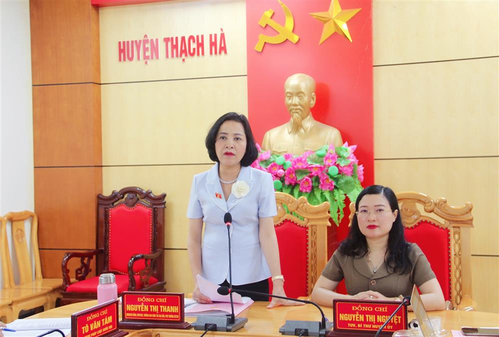 Phát biểu kết luận, Phó Trưởng ban Tổ chức Trung ương Nguyễn Thị Thanh biểu dương những nỗ lực, cố gắng của Đảng bộ, chính quyền và Nhân dân huyện Thạch Hà trong quá trình sắp xếp các đơn vị hành chính; đề nghị huyện tiếp tục tuyên truyền, nâng cao nhận thức trong cán bộ, đảng viên và Nhân dân; phát huy kết quả đã đạt được tại các đơn vị đã thực hiện sắp xếp; quan tâm đầu tư hạ tầng giao thông, bảo đảm liên kết vùng; quy hoạch vùng sản xuất và các cơ cấu kinh tế trên địa bàn. Đồng thời, cần có phương án giải quyết “có tình có lý” trong công tác cán bộ, quan tâm chế độ, chính sách cho đội ngũ cán bộ...