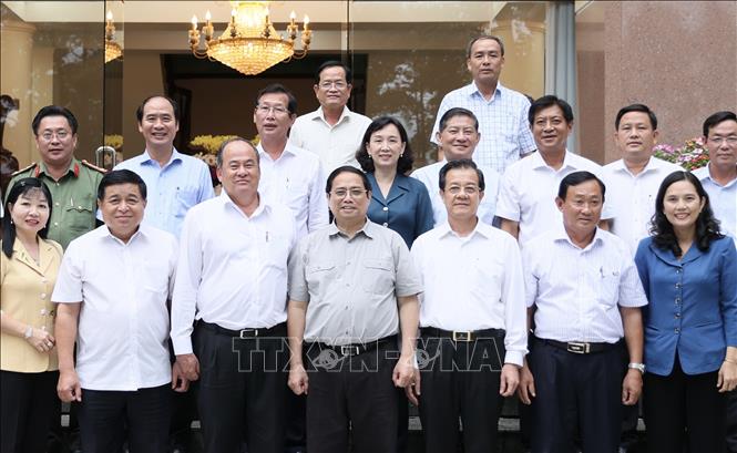 Thủ tướng Phạm Minh Chính với lãnh đạo chủ chốt tỉnh An Giang. Ảnh:TTXVN