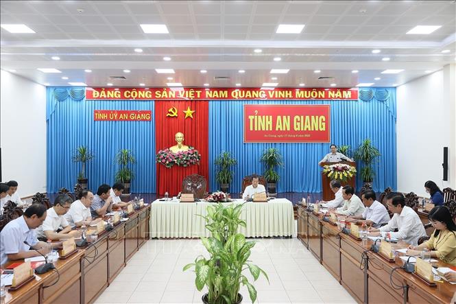 Nhận định tình hình sắp tới và quán triệt quan điểm lãnh đạo, chỉ đạo điều hành mà An Giang cần thực hiện trong thời gian tới, Thủ tướng Chính phủ Phạm Minh Chính yêu cầu tỉnh tiếp tục quán triệt, cụ thể hóa Nghị quyết Đại hội XIII của Đảng; triển khai thực hiện hiệu quả mục tiêu, nhiệm vụ đề ra trong Kế hoạch 5 năm, Chiến lược 10 năm và Nghị quyết Đại hội Đảng bộ tỉnh lần thứ XI; chủ động xây dựng các Nghị quyết, Đề án, Quy hoạch phát triển để triển khai thực hiện Nghị quyết số 13-NQ/TW về phát triển kinh tế-xã hội, bảo đảm quốc phòng, an ninh vùng Đồng bằng sông Cửu Long; Nghị quyết 120/NQ-CP về phát triển bền vững Đồng bằng sông Cửu Long thích ứng với biến đổi khí hậu.