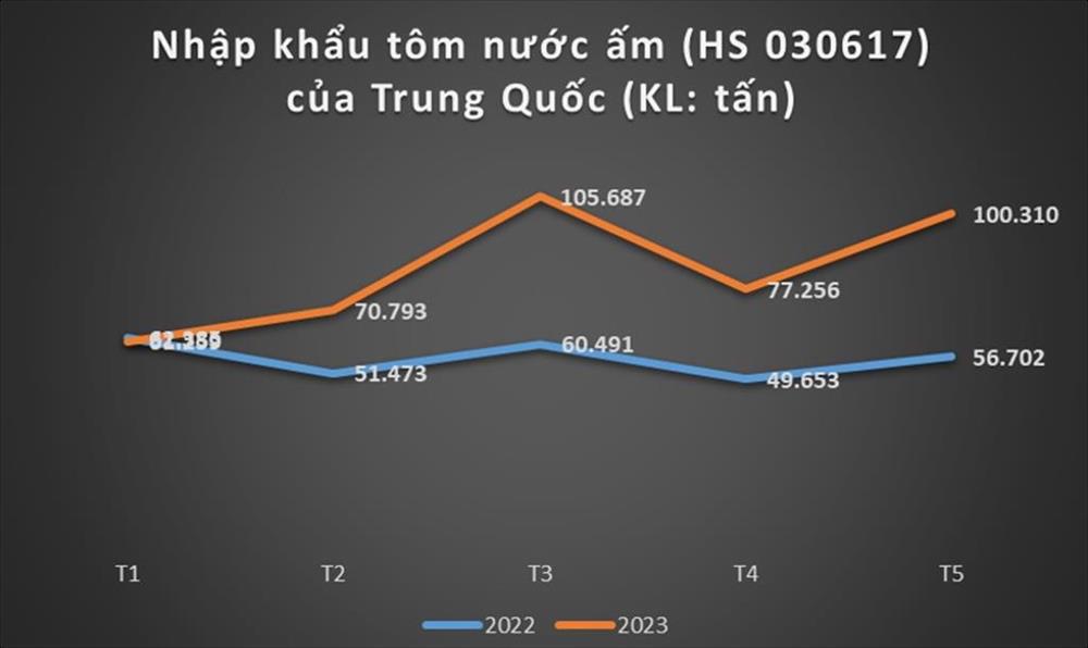 Theo số liệu của Hải quan Trung Quốc, lượng tôm nhập khẩu của nước này trong tháng 5 tăng mạnh 77% so với cùng kỳ năm ngoái lên 100.310 tấn; giá trị nhập khẩu tăng 55% lên 579 triệu USD. Tính chung 5 tháng qua, lượng tôm nhập khẩu tăng 48% lên 415.305 tấn; kim ngạch cũng tăng 28% lên 2,3 tỷ USD.
