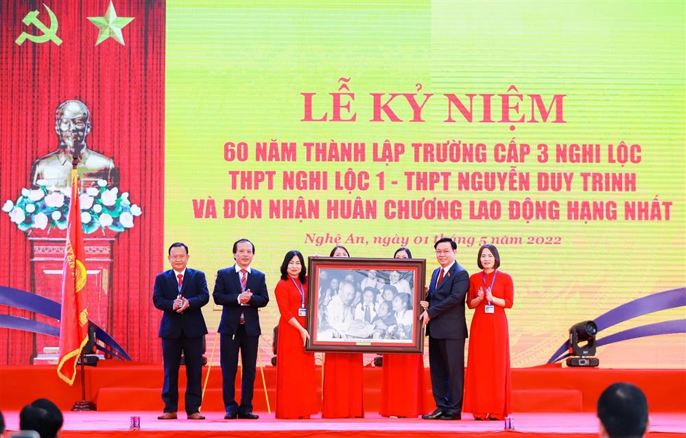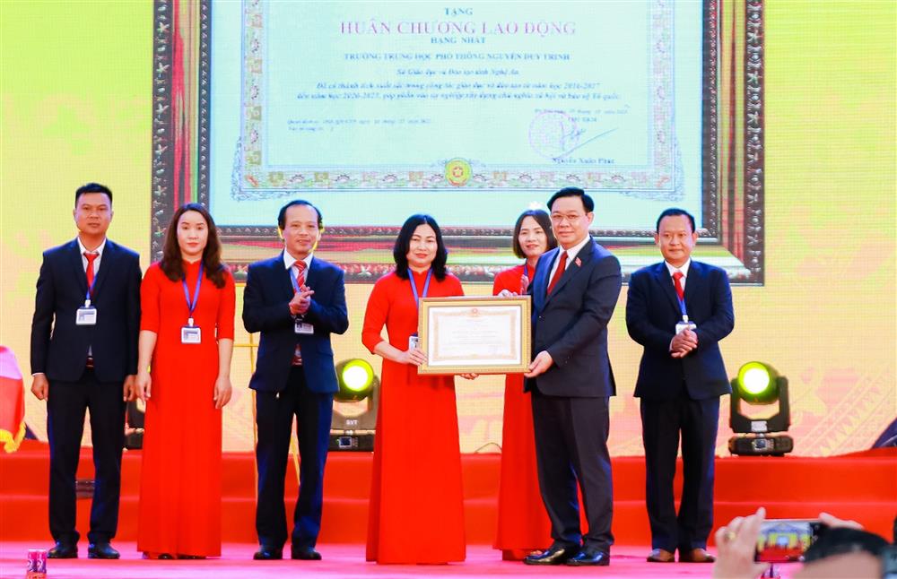 Tại buổi lễ, thay mặt Lãnh đạo Đảng và Nhà nước, Chủ tịch Quốc hội Vương Đình Huệ đã trao Huân chương Lao động hạng Nhất lần thứ 2 tặng cán bộ, giáo viên và học sinh Trường THPT Nguyễn Duy Trinh.