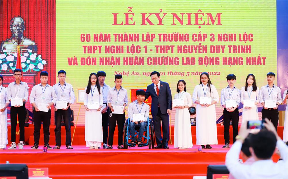 Chủ tịch Quốc hội Vương Đình Huệ trao 60 suất học bổng cho học sinh Trường THPT Nguyễn Duy Trinh. Ảnh: TD