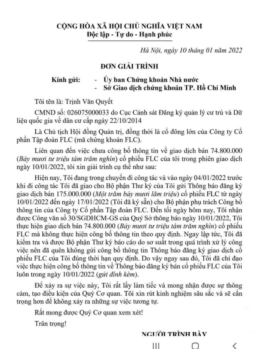 Trong văn bản giải trình của ông Trịnh Văn Quyết, lãnh đạo tập đoàn này cho biết, văn bản đăng ký bán 175 triệu cổ phiếu FLC đã được ông ký sẵn, giao cho bộ phận phụ trách Công bố thông tin của FLC trước khi đi công tác vào ngày 4/1. Tuy nhiên, bộ phận Thư ký sơ suất trong quá trình xử lý công việc nên đã quên không gửi công bố thông tin Thông báo đăng ký giao dịch đúng thời hạn quy định.